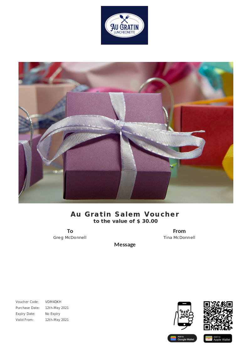 Au Gratin Salem allows you to purchase instantly printable gift vouchers, special offers and tickets using the Voucher Connect platform.